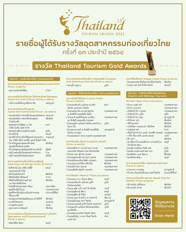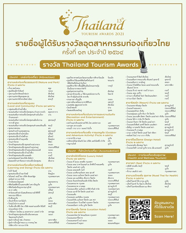 ทั้งนี้ สามารถตรวจสอบรายชื่อผู้ประกอบการที่ได้รับรางวัลอุตสาหกรรมท่องเที่ยวไทย (Thailand Tourism Awards) ครั้งที่ 13 ประจำปี 2564 ได้ที่ www.tourismthailand.org/tourismawards หรือ www.facebook.com/thailandtourismawards