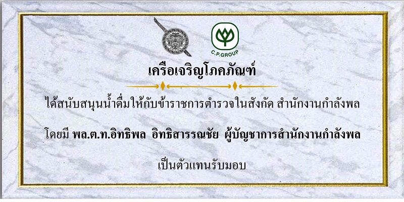 พลตำรวจโทอิทธิพล อิทธิสารรณชัย ผู้บัญชาการสำนักงานกำลังพล รับมอบน้ำดื่มจาก ผู้บริหารบริษัท เครือเจริญโภคภัณฑ์ จำกัด (CP) จำนวน ๑๘,๐๐๐ ขวด เพื่อสนับสนุนภารกิจข้าราชการในสังกัด สำนักงานกำลังพล ตร.