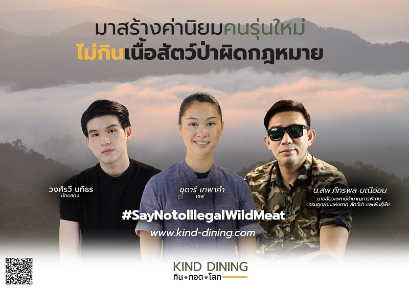แคมเปญ ‘Kind Dining กิน.กอด.โลก’ ชวนคนรุ่นใหม่ให้คำมั่นสัญญาไม่กินเนื้อสัตว์ป่าผิดกฎหมาย ร่วมกับผู้เชี่ยวชาญ ดาราและผู้มีชื่อเสียง เช่น คุณวงศ์รวี นทีธร (สกาย) นายสัตวแพทย์ภัทรพล มณีอ่อน (หมอล็อต) และคุณชุดารี เทพาคำ (เชฟตาม) เพื่อปกป้องและอนุรักษ์สัตวป่า รวมทั้งลดความเสี่ยงของโรคระบาดที่เกิดจากสัตว์ป่า เช่น ซาร์ส และอาจรวมถึงโควิด-19