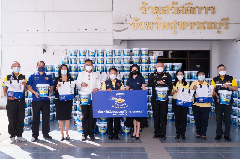อมรรัตน์ ชัยยศบูรณะ ที่ปรึกษาประธานเจ้าหน้าที่บริหาร กลุ่มบริษัท เบเยอร์ จำกัด ส่งมอบถังยังชีพ จำนวน 1,000 ชุด ประกอบด้วย ข้าวสาร ปลากระป๋อง บะหมี่กึ่งสำเร็จรูป นมกล่อง ให้แก่ ณัฐภัทร สุวรรณประทีป ผู้ว่าราชการจังหวัดสุพรรณบุรี และทีมบรรเทาสาธารณภัย จังหวัดสุพรรณบุรี เพื่อนำไปกระจายความช่วยเหลือแก่ประชาชนผู้ประสบอุทกภัยในพื้นที่จังหวัดสุพรรณบุรี ตามนโยบายตอบแทนสังคมของสีเบเยอร์ ภายใต้โครงการ Beger Be Happy ณ ศาลากลางจังหวัดสุพรรณบุรี เมื่อวันก่อน