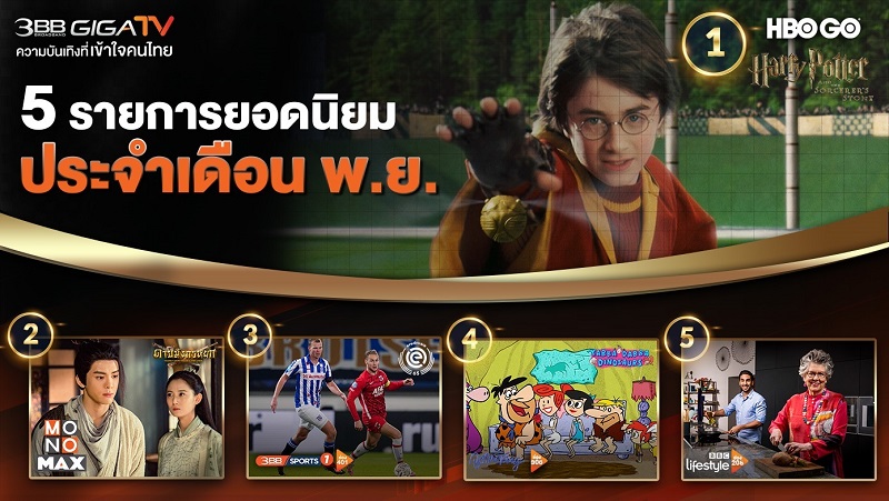 เดินหน้าให้บริการกล่องทีวี 3BB GIGATV” ที่ชูคอนเซปต์ “ความบันเทิงที่เข้าใจคนไทย” ครบทุกความบันเทิงระดับพรีเมียมกว่า 30 ช่อง ทั้งหนัง ซีรีส์ การ์ตูน กีฬา วาไรตี้ สารคดี และ พร้อมกระแสการตอบรับจากผู้ชมตัวจริงที่นั่งติดขอบจอในเดือนพฤศจิกายนที่ผ่านมา กับภาพยนตร์แฟนตาซีสุดยิ่งใหญ่แห่งทศวรรษ Harry Potter” ที่พาเหรดฉายต่อเนื่อง ตั้งแต่ภาค 1 ถึง ภาค 7.2 ให้ชมอย่างจุใจ พร้อมรายการอื่น ๆ ที่ติดอันดับ 5 รายการยอดนิยมประจำเดือนพฤศจิกายน ที่ไม่ควรพลาดติดตามโดยเด็ดขาด