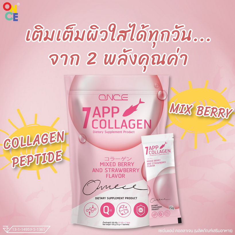 สำหรับ 7APP Collagen คอลลาเจนสัญญาติญี่ปุ่น ผลิตจาก ไฮโดรไลซด์ คอลลาเจน ไตรเปปไทด์ และเปปไทด์จากปลา อัดแน่นมากกว่า 10,000 มิลลิกรัม รสมิกซ์เบอร์รี่+สตรอเบอร์รี่ มากล้นไปด้วยสารสกัดที่มีประโยชน์อีกมากมาย (มีโคเอ็นไซม์ คิวเท็น และสารต้านอนุมูลอิสระ)