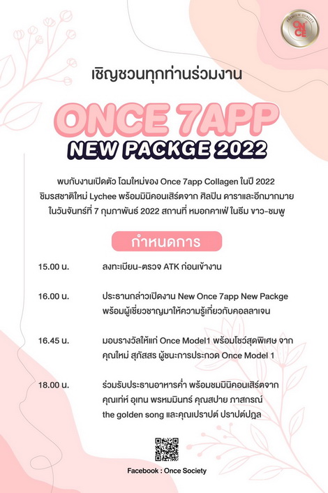 พบกับงานเปิดตัว โฉมใหม่ของ Once 7app Collagen ในปี 2022 ชิมรสชาติใหม่ Lychee พร้อมมินิคอนเสิร์ตจาก ศิลปิน ดาราและอีกมากมาย