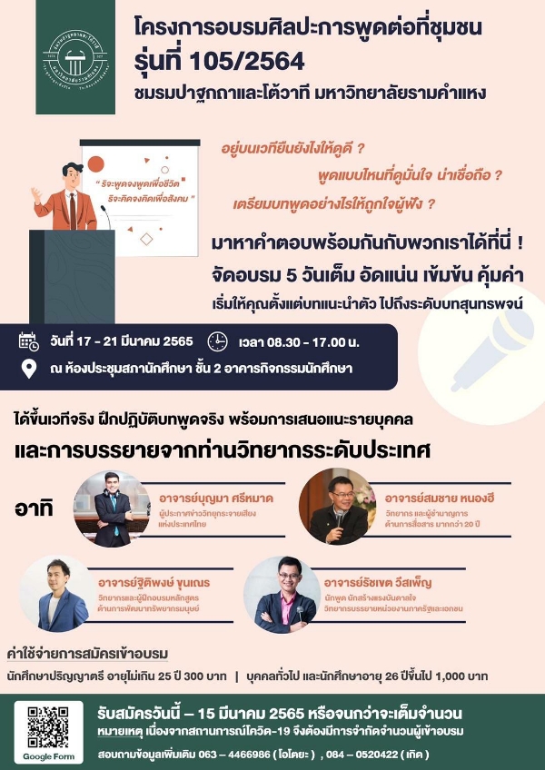 ชมรมปาฐกถาและโต้วาที มหาวิทยาลัยรามคำแหง จัดฝึกอบรมศิลปะการพูดในที่ชุมนุมชน ขั้นพื้นฐาน 5 วันเต็ม สำหรับนักศึกษาและบุคคลผู้สนใจทั่วไป หลักสูตรอัดแน่นไปด้วยพื้นฐานการพูด ศิลปะการพูด การวิเคราะห์ผู้ฟัง และการแก้ปัญหาเฉพาะหน้าด้านการพูด เรียนรู้5วันเต็มกับวิทยากรมืออาชีพ เป็นการบรรยาย 30 เปอร์เซ็นต์ ฝึกปฏิบัติ 70เปอร์เซ็นต์ เรียนจบรับวุฒิบัตรจากชมรมฯ ผ่านการฝึกอบรมหลักสูตรนี้ เป็นนักพูดมืออาชีพได้แน่นอน