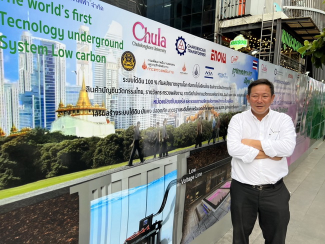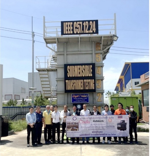 “สำนักงานจัดการทรัพย์สิน จุฬาลงกรณ์มหาวิทยาลัย เยี่ยมชม การทดสอบ “หม้อแปลงซับเมอร์ส” Low Carbon เจริญชัยฯ” ที่แรงต้านน้ำ 3 เมตร ตามมาตรฐาน IEEE Std.C57.12.24 ที่จะทำการติดตั้ง ซึ่งเป็นส่วนหนึ่งของการพัฒนาพื้นที่เมืองอัจฉริยะ (Smart City) เพิ่มจุด Check in แห่งแรกของประเทศไทย ให้นักท่องเที่ยว เที่ยวชม และเป็นแหล่งให้ความรู้ด้านไฟฟ้า ความมั่นคง ปลอดภัยและประหยัดพลังงาน (IoT) อันทันสมัยในการนำสายไฟฟ้าลงดินทั้งระบบ เพื่อการสร้างทัศนีย์ภาพใหม่ในพื้นที่”