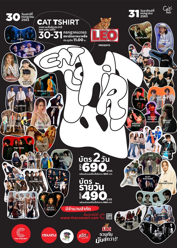 สามารถอัปเดตรายชื่อบูธจำหน่ายเสื้อยืดเพิ่มเติมทั้งหมด พร้อมคิวการแสดงสดของทุก ๆ ศิลปิน ได้ที่ fb/thisiscatradio www.thisiscat.com app: Cat Radio ชอบเสื้อยืดลวดลายของใคร เพลงวงไหน ก็เตรียมไปยืดก่อนงานจริงกันซะเดี๋ยวนี้ เพราะข่าวแว่ว ๆ มา บัตรใกล้หมดเข้าไปทุกที แล้ว บัตร 2 วัน ราคา 690 บาท ส่วนบัตรรายวัน ราคา 490 บาท ทุกราคามีคูปองส่วนลดซื้อเสื้อในงานมูลค่ารวม 600 บาท แบบไหนก็คุ้ม จิ้มแล้วจองด่วน ๆ ที่ http://bit.ly/3sZfs3E