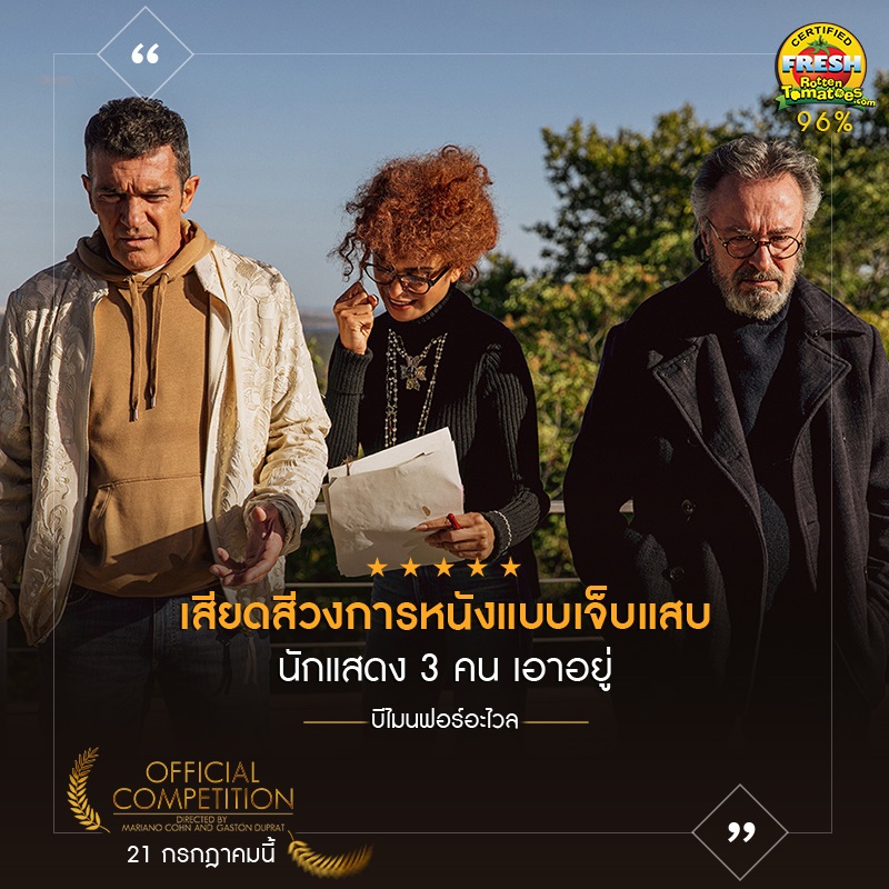 โดย Official Competition เล่าเรื่องของ โลลา ผู้กำกับหนังอาร์ตชื่อดัง (เพเนโลปี ครูซ) ได้รับการว่าจ้างจากมหาเศรษฐีให้ทำหนังอะไรก็ได้ที่ “ต้องดัง” และ “กวาดทั้งเงิน และรางวัล” โลลาจึงเกิดไอเดีย เอานักแสดงชาย 2 คนที่ต่างกันสุดขั้ว มาเล่นหนังเรื่องนี้ คนแรกคือ เฟลิกซ์ (อันโตนิโอ บันเดอรัส) ซูเปอร์สตาร์ขาใหญ่จากฮอลลีวูด และคนต่อมาคือ อีวาน (ออสการ์ มาร์ติเนซ) นักแสดงละครเวทียอดฝีมือซึ่งได้รับการยกย่องให้เป็น “ปรมาจารย์แห่งการแสดง” การปะทะกันของอีโก้ของชายสองคน โดยมีผู้กำกับสาวจอมป่วนเป็นตัวเร่งปฏิกิริยา จึงส่อเค้าว่า ความสนุกระดับบรรลัยจะเกิดขึ้นก่อนที่จะได้ถ่ายหนังจริง ๆ