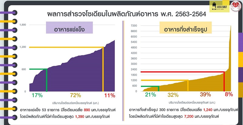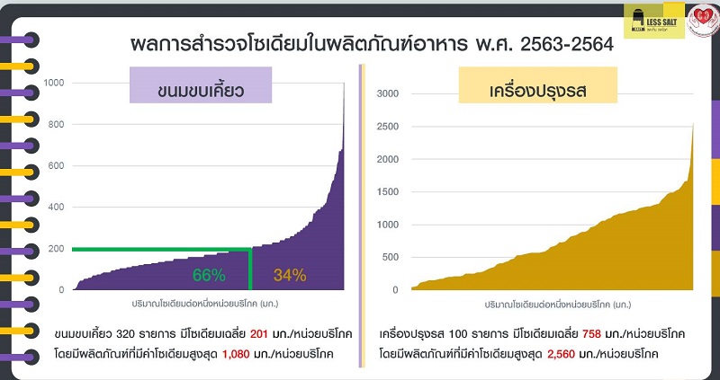 ด้าน รศ.นพ.สุรศักดิ์ กันตชูเวสศิริ ประธานเครือข่ายลดบริโภคเค็ม กล่าวว่า คนไทยกินเค็มเกินความต้องการของร่างกายถึงเกือบ 2 เท่า จึงเป็นสาเหตุของการเจ็บป่วยด้วยโรคไม่ติดต่อเรื้อรัง NCDs ที่สำคัญในช่วงระยะเวลา 2 ปีที่ผ่านมาเกิดวิกฤตการณ์แพร่กระจายของเชื้อไวรัสโควิด-19 ส่วนหนึ่งทำให้มีผู้คนมากมายติดเชื้อโควิด-19 โดยเฉพาะผู้สูงอายุและผู้ป่วยโรคไตที่อาการมากกว่าคนทั่วไป ในส่วนของการส่งเสริมกิจกรรมลดพฤติกรรมการบริโภคเค็มได้ดำเนินการในทุก ๆ ด้าน โดยผลการสำรวจโซเดียมในผลิตภัณฑ์อาหารในปี 2563-2564 ร่วมกับสมาคมเพื่อนโรคไต  ได้มีการเก็บข้อมูลผลิตภัณฑ์อาหาร 4 กลุ่ม ประกอบด้วย 1. กลุ่มอาหารแช่แข็ง 53 รายการ มีโซเดียมเฉลี่ย 890 มิลลิกรัม/บรรจุภัณฑ์ มากกว่าคำแนะนำขององค์การอนามัยโลกที่กำหนดให้ปริมาณโซเดียมจากอาหารหลักควรได้รับไม่เกิน 600 มิลลิกรัม/มื้อ  2. กลุ่มอาหารกึ่งสำเร็จรูป 300 รายการ ได้แก่ บะหมี่ โจ๊กและซุปกึ่งสำเร็จรูป มีโซเดียมเฉลี่ย 1,240 มิลลิกรัม มากกว่า 2 เท่าของคำแนะนำขององค์อนามัยโลกที่กำหนดให้ปริมาณโซเดียมจากอาหารหลักควรได้รับไม่เกิน 600 มิลลิกรัม/มื้อ 3. กลุ่มขนมขบเคี้ยว 400 รายการ โดยแบ่งเป็นกลุ่มขนมขบเคี้ยวรสชาติเค็ม ได้แก่ มันฝรั่ง ข้าวเกรียบ ถั่ว สาหร่าย ปลาเส้น 320 รายการ มีค่าโซเดียมเฉลี่ย 201 มิลลิกรัมต่อหน่วยบริโภค ซึ่งมากกว่าคำแนะนำจากองค์การอนามัยโลกที่กำหนดให้ปริมาณโซเดียมจากอาหารระหว่างมื้อควรได้รับ ไม่เกิน 100 มิลลิกรัมต่อมื้อ  และ 4. กลุ่มเครื่องปรุงรส 100 รายการ มีโซเดียมเฉลี่ย 758 มิลลิกรัมต่อหน่วยบริโภค และเมื่อนำผลการสำรวจมาเทียบเกณฑ์แนะนำของ WHO (sodium benchmark) พบว่า แม้ในแต่ละกลุ่มจะมีบางผลิตภัณฑ์ที่มีปริมาณโซเดียมผ่านเกณฑ์ แต่ค่าเฉลี่ยของโซเดียมในผลิตภัณฑ์อาหารแต่ละกลุ่มล้วนสูงกว่าเกณฑ์ดังกล่าวทั้งสิ้น