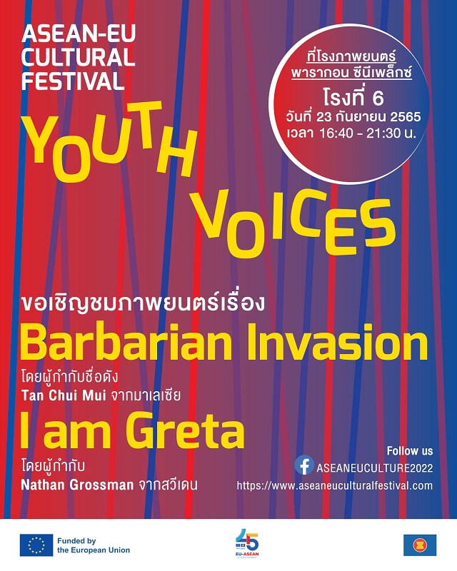 สหภาพยุโรป ฉลองครบรอบ 45 ปี ความสัมพันธ์สหภาพยุโรปและอาเซียน จัดงานเทศกาล “ASEAN-EU CULTURAL FESTIVAL 2022” ภายใต้คอนเซปต์ Youth Voices เชิญชวนคนรุ่นใหม่ที่รักงานศิลปะทุกแขนงร่วมชมภาพยนตร์ ดนตรี และศิลปะ โดยผู้กำกับ ศิลปิน นักดนตรีชื่อดังจากยุโรปและอาเซียน ผ่านช่องทางออนไซน์และออนไลน์ ตลอดเดือนกันยายน 2565 ฟรีโดยไม่เสียค่าใช้จ่าย โดยการแสดงแบ่งออกเป็น 3 ส่วน ได้แก่