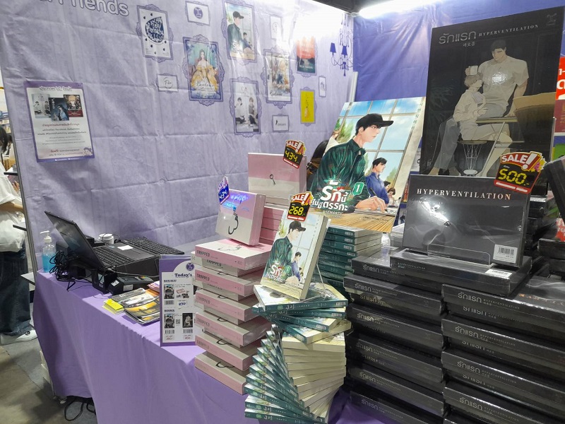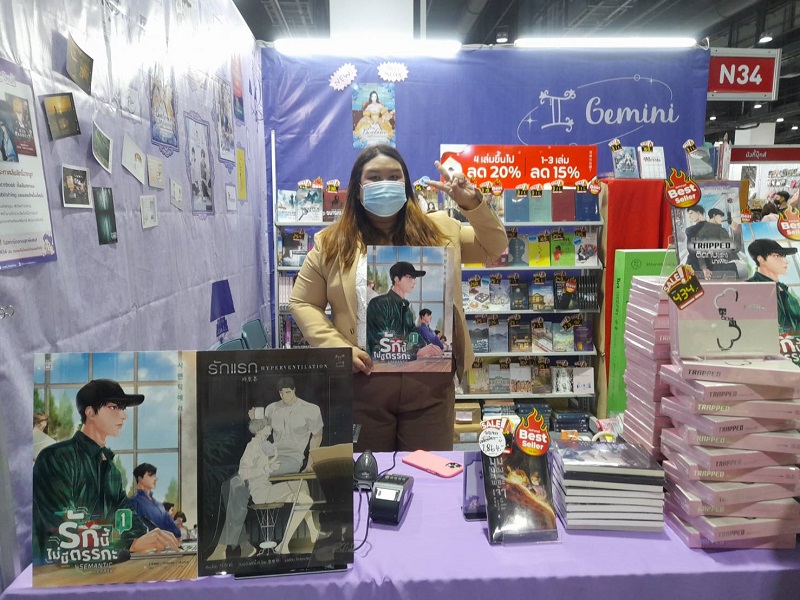 “เราอยู่ที่บูธ N34 นะคะ ซึ่งในบูธเราจะมีหนังสือของเพื่อน ๆ มากมาย ที่เรานำขบวนมาคือ สำนักพิมพ์ Gemini Publishing ค่ะ ตอนนี้ปกเด่น ๆ ของเรามีอยู่ 3 ปกคือเรื่อง รักแรก ต่อมาก็เป็น รักนี้ไม่มีตรรกะ ซึ่งเป็นนักเขียนคนเดียวกันคือ J.Soori สำหรับ รักนี้ไม่มีตรรกะ 3 เล่มจบ ซึ่งเล่ม 2 ต้นเดือนพฤศจิกายนเป็นพรีออร์เดอร์ค่ะ ตอนนี้เรารออนุมัติจากทางเมืองนอกแต่ส่วนเนื้อเรื่องเรียบร้อยแล้ว และอีกเรื่อง TRAPPED ติดกับ(รัก) มาเฟีย ค่ะ จริง ๆ เราจะมีมาสคอตชื่อพี่ เจมี่ จริง ๆ สนพ.ของเราเริ่มมาปี 2019 แล้วอยู่ ๆ โควิดมันก็มา เราเลยหยุดชะงักไป เราเริ่มมาปีนี้เมื่อมีสัญญาณดีขึ้นและมาเปิดบูธที่งานนี้ปีแรก เราถึงเริ่มเคลื่อนไหวอีกครั้งหนึ่งจึงขอนับ 2022 เป็นปีแรกของเราก็แล้วกันค่ะ
