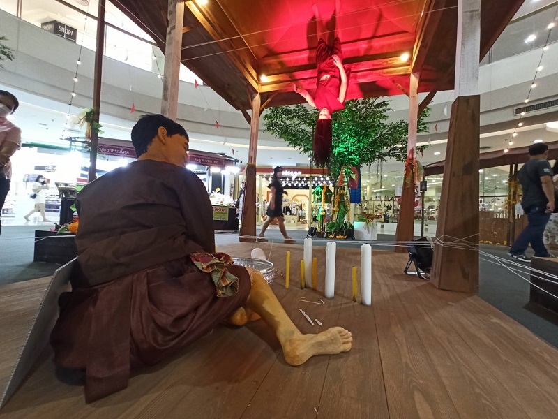“ซีคอนสแควร์เราเปิดพื้นที่โซนมันมัน เป็นพื้นที่ใหม่ ที่เราต้องการสร้างประสบการณ์ใหม่ ๆ ทั้งเรื่องของลูกค้าและสิ่งที่เราต้องการนำเสนอด้วย รวมถึงผู้ที่จะมานำเสนอด้วยว่าจะเป็นรูปแบบไหน อย่างไร ซึ่งพื้นที่นี้ใหญ่มากสองหมื่นเจ็ดพันตารางเมตร ก็มีหลายอย่างประกอบกัน ของโซนที่เกี่ยวกับภาพถ่าย โซนเกี่ยวกับอาหาร โซนเกี่ยวกับกาแฟ หรือโซนต่าง ๆ ที่เป็น เดอะมูนคาเฟ่อยู่ชั้น2 ซึ่งเราจัดชุมชนต่าง ๆ ให้คนที่ชอบอะไรเหมือน ๆ กันได้อยู่ร่วมกัน อันนั้นก็เป็นพื้นที่ของคนรุ่นใหม่ ในขณะเดียวกันพื้นที่ส่วนกลางครับ เราจะเรียก ‘Srinakarian Artibition’ (ศรีนคเรี่ยน อาร์ติบิชัน)เป็นส่วนของโซนมันมันก็นำสิ่งที่น่าสนใจในย่านนี้มาตีความเป็นศิลปะ ศิลปะก็น่าสนใจ ผู้สร้างผลงานก็จะสลับหมุนเวียนกันไป อันนี้เป็นงานแรก “เดือนสลัว กลัวสลาย” เราก็หยิบยกเรื่องราวความลี้ลับของตำนานแม่นาก พระโขนง แห่งวัดมหาบุศย์ มานำเสนอ เพราะอยู่แถว ๆ ย่านศรีนครินทร์ด้วย แล้วเรื่องราวของแม่นากพระโขนงก็มีสร้างเป็นหนังเป็นละครมาตลอดนะครับ จริง ๆ เป็นเรื่องสร้างสรรค์ของทางทีมงานด้วยครับ แต่หัวข้อใหญ่ของซีคอนในช่วงนี้ชื่อว่า “Seacon Halloween The Series” ดังนั้นก็จะมีส่วนของ Day of the Dead สุขสันต์วันแห่งความตาย เทศกาลแห่งความสนุกสนานของชาวแม็กซิโก ถัดมาที่โซนผีไทย ชื่อ Horror Night in MUNx2 พบกับผีฆาตกรสยองขวัญ และร่วมเล่นเกมหาคำตอบว่าใครกันที่เป็นฆาตกรตัวจริง!