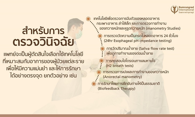 ทั้งนี้ แพทย์ผู้ชำนาญการจะเป็นผู้ตัดสินใจเลือกเทคโนโลยีที่นำมาตรวจวินิจฉัยให้เหมาะสมกับผู้ป่วยแต่ละราย เพื่อให้มีความแม่นยำและให้การรักษาได้อย่างตรงจุด เช่น เทคโนโลยีเพื่อตรวจการบีบตัวของหลอดอาหาร กระเพาะอาหาร ลำไส้เล็ก และการตรวจการทำงานของทวารหนักและหูรูดทวารหนัก, การวัดปริมาณน้ำลาย เพื่อดูการทำงานของต่อมน้ำลาย, การทดสอบไฮโดรเจนทางลมหายใจ, การตรวจวัดความเป็นกรดในหลอดอาหาร 24 ชั่วโมง หรือการรักษาโดยการฝึกขับถ่ายให้เป็นธรรมชาติ สำหรับผู้ป่วยที่มีภาวะท้องผูกและกลั้นอุจจาระไม่ได้ โดยผู้ป่วยท้องผูกที่รับประทานยาระบายแล้วอาการไม่ดีขึ้น ประมาณ 40% เกิดจากการเบ่งถ่ายที่ผิดวิธี แพทย์และพยาบาลจะช่วยสอนให้ผู้ป่วยเรียนรู้ที่จะเบ่งและคลาย นำไปสู่การรักษาให้หายขาดได้
