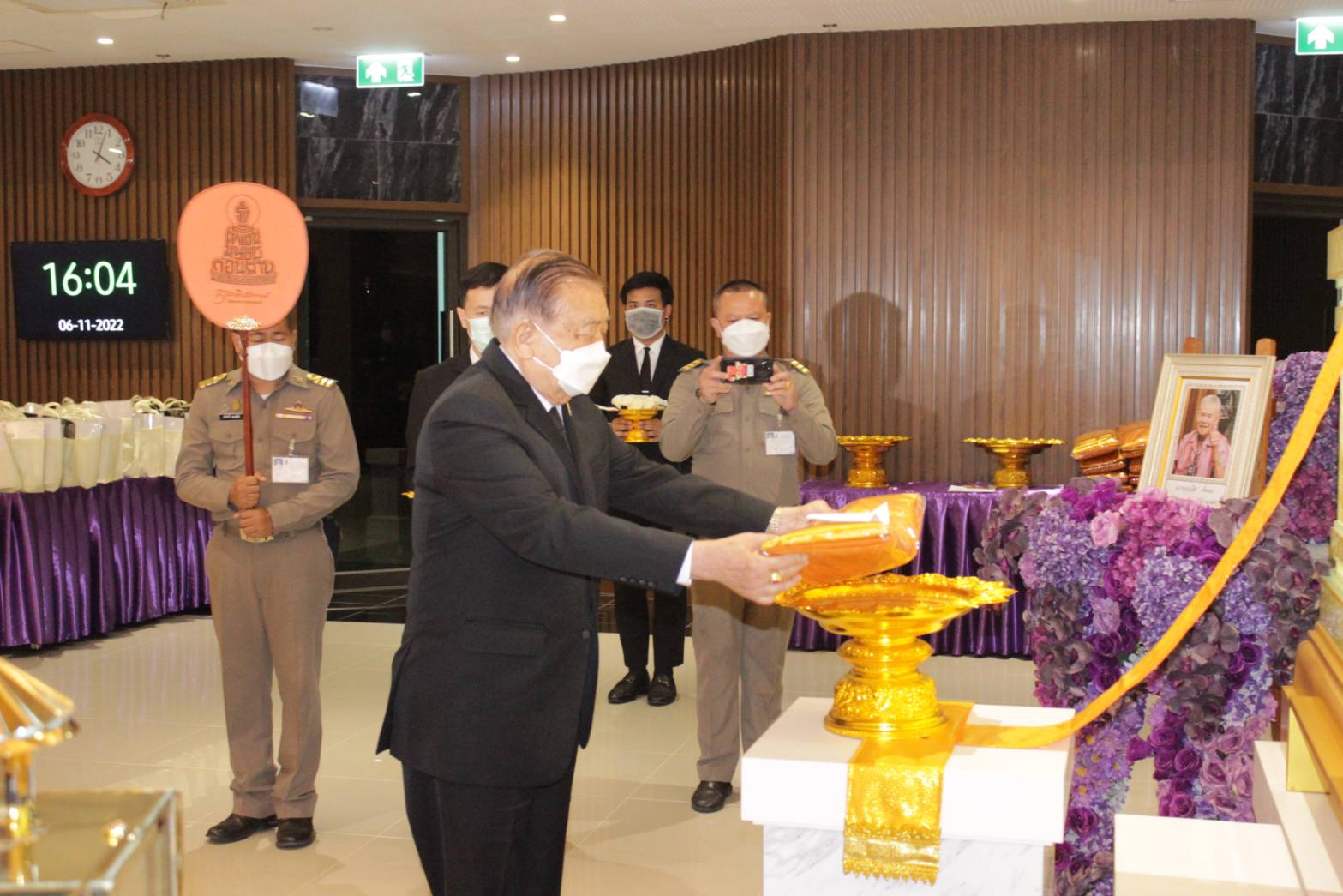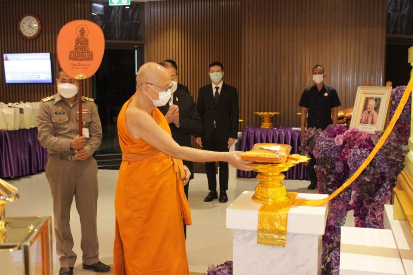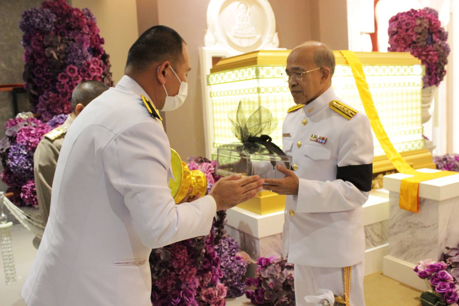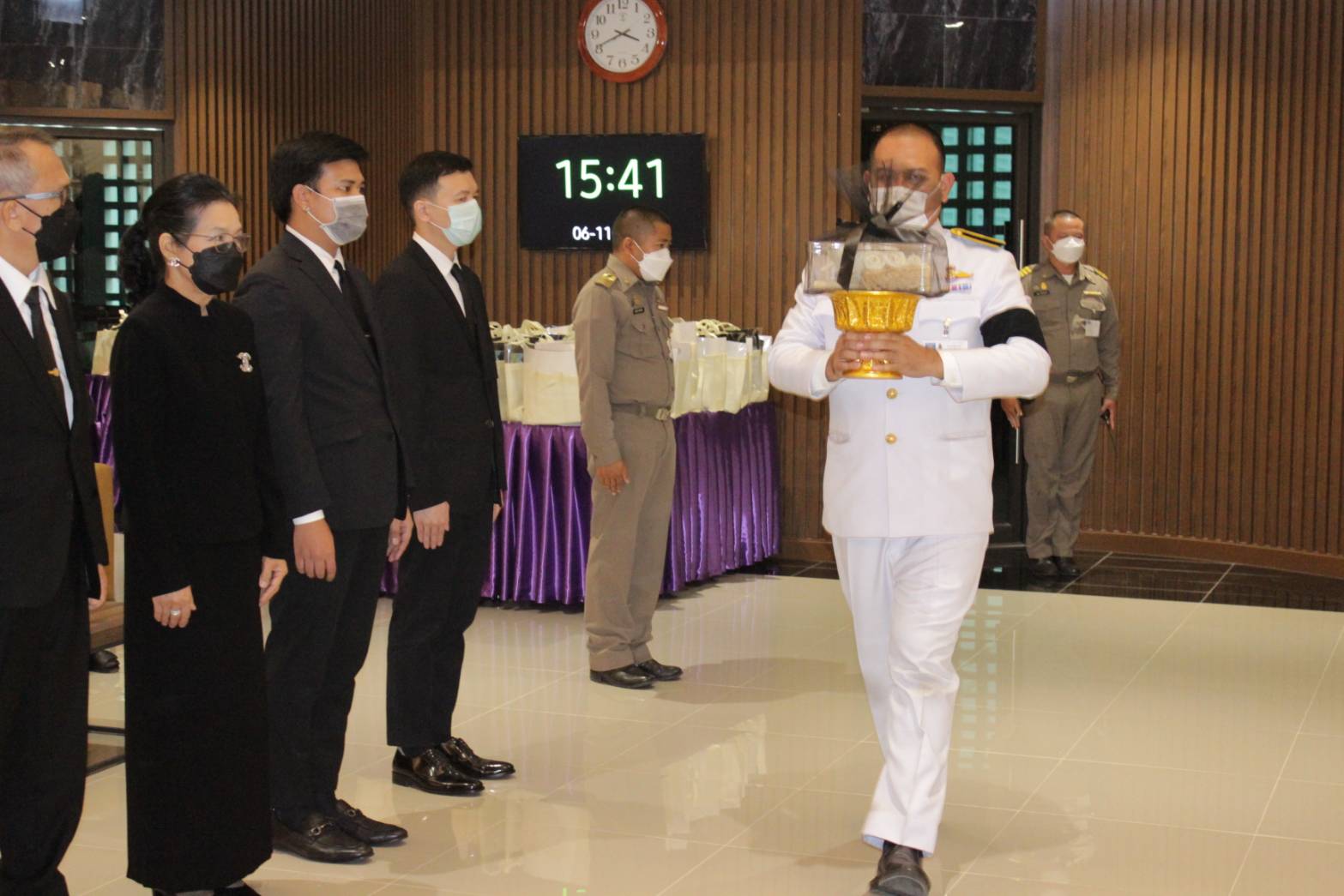คณะเจ้าภาพตั้งแถว รับกล่องเพลิงพระราชทาน เจ้าหน้าที่สำนักพระราชวัง อัญเชิญกล่องเพลิงพระราชทาน ขึ้นวางประจำจุด โดยมีพลเอก ดร.เทอดศักดิ์ มารมย์ เป็นประธาน ฝ่ายฆราวาส ประกอบพิธีพระราชทานเพลิงศพในครั้งนี้