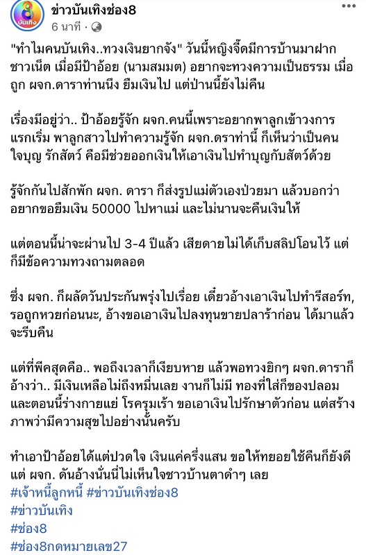 โดยเรื่องมีอยู่ว่า… ป้าอ้อยรู้จัก ผจก.คนนี้เพราะอยากพาลูกเข้าวงการ แรกเริ่มพาลูกสาวไปทำความรู้จัก ผจก.ดาราท่านนี้ ก็เห็นว่าเป็นคนใจบุญ รักสัตว์ คือมีช่วยออกเงินให้เอาเงินไปทำบุญกับสัตว์ด้วย รู้จักกันไปสักพัก ผจก. ดารา ก็ส่งรูปแม่ตัวเองป่วยมา แล้วบอกว่าอยากขอยืมเงิน 50,000 ไปหาแม่ และไม่นานจะคืนเงินให้ แต่ตอนนี้น่าจะผ่านไป 3-4 ปีแล้ว เสียดายไม่ได้เก็บสลิปโอนไว้ แต่ก็มีข้อความทวงถามตลอด ซึ่ง ผจก. ก็ผัดวันประกันพรุ่งไปเรื่อย เดี๋ยวอ้างเอาเงินไปทำรีสอร์ต, รอถูกหวยก่อนนะ, อ้างขอเอาเงินไปลงทุนขายปลาร้าก่อน ได้มาแล้วจะรีบคืน แต่ที่พีคสุดคือ.. พอถึงเวลาก็เงียบหาย แล้วพอทวงยิก ๆ ผจก.ดาราก็อ้างว่า.. มีเงินเหลือไม่ถึงหมื่นเลย งานก็ไม่มี ทองที่ใส่ก็ของปลอม และตอนนี้ร่างกายแย่ โรครุมเร้า ขอเอาเงินไปรักษาตัวก่อน แต่สร้างภาพว่ามีความสุขไปอย่างนั้นครับ ทำเอาป้าอ้อยได้แต่ปวดใจ เงินแค่ครึ่งแสน ขอให้ทยอยใช้คืนก็ยังดี แต่ ผจก. ดันอ้างนั่นนี่ไม่เห็นใจชาวบ้านตาดำ ๆ เลย”
