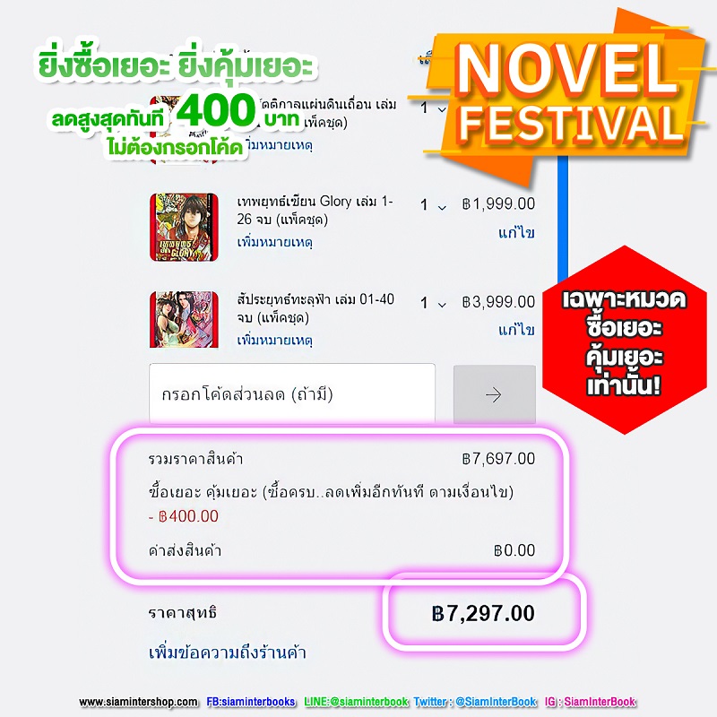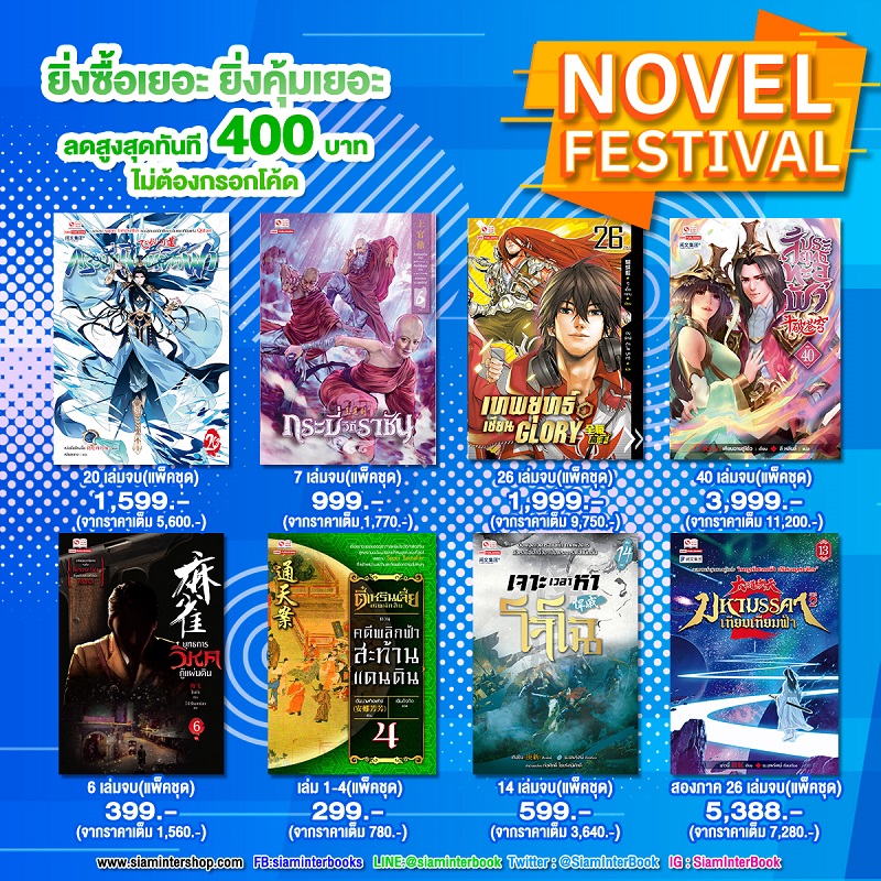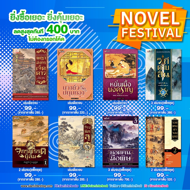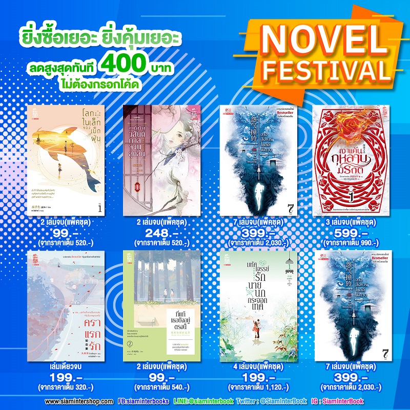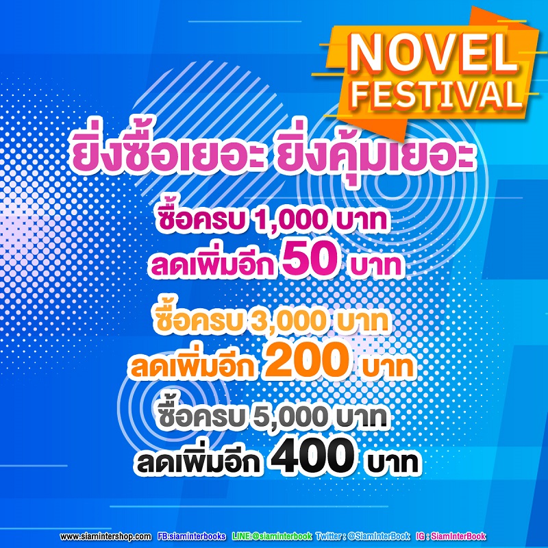 Siam inter book จัดโปรโมชันเอาใจคอนิยายโดยเฉพาะ กับโปรโมชัน “Novel Festival” กับดีลสุดพิเศษ “ซื้อเยอะ คุ้มเยอะ” ลดเพิ่มทันทีสูงสุดถึง 400 บาท เฉพาะที่ www.siamintershop.com เท่านั้น