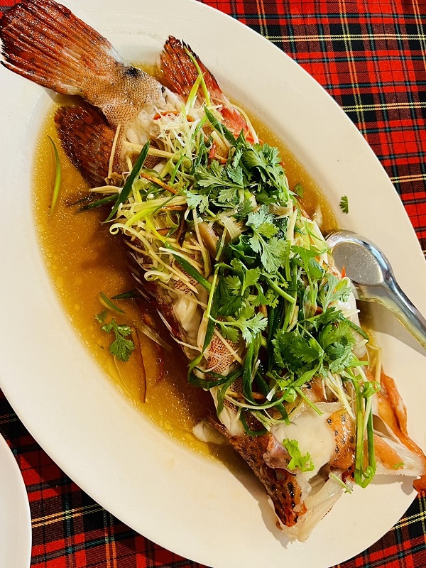 เมนูที่ 2 “ปลาเก๋าน้ำแดงนึ่งซีอิ๊ว” เนื้อปลาเก๋าสดเด้งๆ สุกกำลังดี ขอบอกว่าอร่อยกลมกล่อมมาก ๆ ครับ
