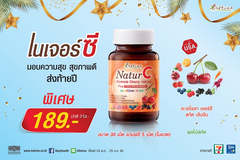 “บีไชน์ เนเจอร์ซี” ขนาดบรรจุ 30 เม็ด (แถมฟรีอีก 5 เม็ดในขวด) จัดโปรโมชั่นสุขคุ้มเวอร์ ส่งท้ายปี ลดราคาพิเศษ เหลือเพียง 189 บาท จากปกติ ราคา 249 บาท ตั้งแต่วันนี้ – 25 ธันวาคม 2565 หาซื้อได้ที่ร้านเซเว่น อีเลฟเว่น ทุกสาขาทั่วประเทศ สามารถดูข้อมูลเพิ่มเติมได้ที่ www.bshine.co.th, FB : https://www.facebook.com/BnpHealth และ Line : @Bshine