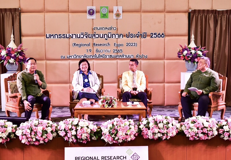 วันที่ 19 ธันวาคม 2565 สำนักงานการวิจัยแห่งชาติ (วช.) มหาวิทยาลัยเทคโนโลยีราชมงคล ล้านนา ภายใต้ กระทรวงการอุดมศึกษา วิทยาศาสตร์ วิจัยและนวัตกรรม ร่วมกันจัด แถลงข่าวการจัดงาน “มหกรรมงานวิจัยส่วนภูมิภาค ประจำปี 2566 (Regional Research Expo 2023)” ครั้งที่ 11 ภาคเหนือ โดยมี นายจำลักษ์ กันเพ็ชร์ รองผู้ว่าราชการจังหวัดลำปาง ดร.วิภารัตน์ ดีอ่อง ผู้อำนวยการสำนักงานการวิจัยแห่งชาติ และ ผศ.ดร.จัตตุฤทธิ์ ทองปรอน อธิการบดีมหาวิทยาลัยเทคโนโลยีราชมงคลล้านนา ร่วมกันแถลงข่าว ณ ห้องประชุมซอมพอ มหาวิทยาลัยเทคโนโลยีราชมงคลล้านนา จังหวัดลำปาง