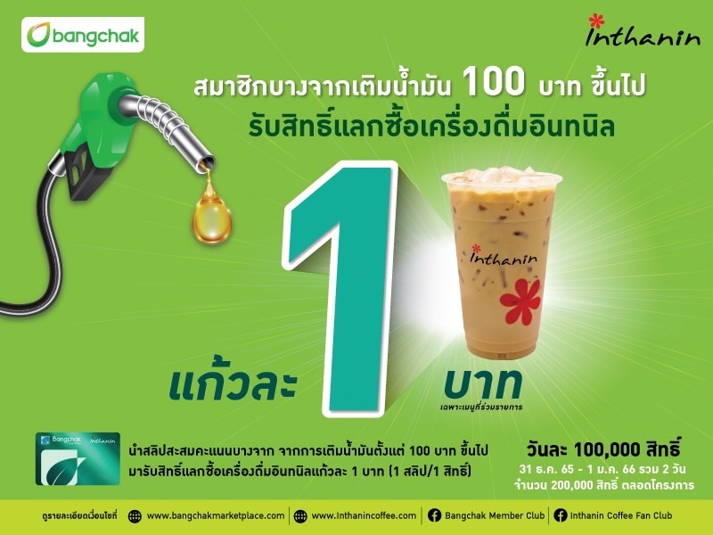 นายสมชัย เตชะวณิช ประธานเจ้าหน้าที่การตลาดและรองกรรมการผู้จัดการใหญ่ กลุ่มธุรกิจการตลาด บริษัท บางจาก คอร์ปอเรชั่น จำกัด (มหาชน) กล่าวว่า ในช่วงเทศกาลปีใหม่ทุกปี บางจากฯ จะจัดกิจกรรมเพื่อร่วมส่งมอบความสุขแก่ลูกค้าสมาชิกบางจาก โดยจัดรายการสมนาคุณต่างๆ เป็นระยะๆ ในช่วงเดือนธันวาคมต่อเนื่องไปถึงเดือนมกราคม ล่าสุดนี้จะจัดรายการสมนาคุณสุดคุ้มค่า ให้สมาชิกบางจากกรีนไมลส์นำสลิปสะสมคะแนนจากการเติมน้ำมันผลิตภัณฑ์ใดก็ได้ตั้งแต่ 100 บาทขึ้นไป (เฉพาะสลิปที่เติมน้ำมันในวันที่ 31 ธันวาคม 2565 และ 1 มกราคม 2566) รับสิทธิ์แลกซื้อเครื่องดื่มอินทนิลในราคาเพียงแก้วละ 1 บาทเท่านั้น เฉพาะ 6 เมนูเครื่องดื่มเย็นยอดนิยม ได้แก่ เอสเพรสโซ่ อเมริกาโน่ โกโก้ ชาไทยลาเต้ ชาเขียวลาเต้ และชามะนาว (1 สลิป ต่อ 1 สิทธิ) ในวันที่ 31 ธันวาคม 2565 และ 1 มกราคม 2566 วันละ 100,000 สิทธิ์ จำกัดไม่เกิน 200,000 สิทธิ์ตลอดรายการ ณ ร้านอินทนิลทั่วประเทศที่ร่วมรายการ ดูรายละเอียดเพิ่มเติมได้ที่ www.bcpgreenmiles.com หรือโทร. 1651 กด 3