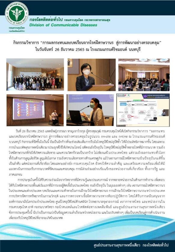 เมื่อวันที่ 26 ธันวาคม 2565 แพทย์หญิงวรรณา หาญเชาว์วรกุล ผู้ทรงคุณวุฒิ กรมควบคุมโรคได้เปิดกิจกรรมวิชาการ “ผลกระทบและบทเรียนจากโรคฝีดาษวานร สู่การพัฒนาอย่างครอบคลุมในรูปแบบ on-site และ online ณ โรงแรมแกรนด์ริชมอนด์     จ.นนทบุรี กิจกรรมที่จัดขึ้นในวันนี้ ถือเป็นอีกก้าวที่จะช่วยเติมเต็มการรับมือโรคอุบัติใหม่อุบัติซ้ำ ให้มีประสิทธิภาพมากขึ้น โดยเฉพาะการนำแนวคิดสุขภาพหนึ่งเดียวมาประยุกต์ใช้ให้เกิดประโยชน์ อดีตจนถึงปัจจุบัน โรคอุบัติใหม่อุบัติซ้ำหลายโรคที่มีการระบาด รวมถึงโรคฝีดาษวานรที่ก่อให้เกิดความเสียหาย และความวิตกกังวลเป็นวงกว้าง ไม่เพียงแต่ในประเทศไทย แต่รวมถึงผลกระทบทั่วโลก        ทั้งในด้านการสูญเสียชีวิต สูญเสียโอกาส รวมถึงความเสียหายทางด้านเศรษฐกิจ แม้ว่าสถานการณ์โรคฝีดาษวานรในปัจจุบันจะดีขึ้นเป็นลำดับ แต่หน่วยงานที่เกี่ยวข้อง โดยเฉพาะอย่างยิ่ง กรมควบคุมโรค ยังคงให้ความสำคัญ และเตรียมความพร้อมเพื่อให้มีแนวทางในการรองรับการระบาดที่ชัดเจนและครอบคลุม การมีส่วนร่วมอย่างเข้มแข็งของหน่วยงานที่เกี่ยวข้อง ทั้งภารรัฐ และภาคเอกชน