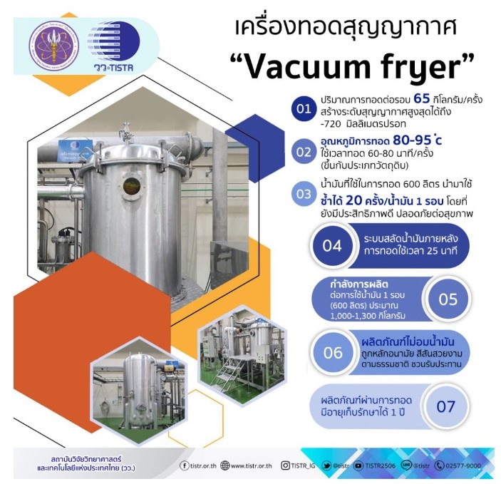 ศ. (วิจัย) ดร.ชุติมา กล่าวต่อไปว่า ล่าสุด วว. ได้มีการสร้างสรรค์พัฒนา นวัตกรรมเครื่องทอดสุญญากาศ (Vacuum fryer) เพื่อช่วยผู้ประกอบการลดต้นทุนการผลิต และยังตอบโจทย์ผู้บริโภคโดยเครื่องทอดสุญญากาศ มีปริมาณการทอดต่อรอบได้สูงถึง 65 กิโลกรัม สามารถสร้างสุญญากาศสูงสุดได้ถึง 720 มิลลิเมตรปรอท โดยใช้อุณหภูมิในการทอด 80-95 องศาเซลเซียส ใช้เวลา 60-80 นาที/ครั้ง (ขึ้นกับประเภทวัตถุดิบ) สามารถนำน้ำมันมาใช้ทอดซ้ำได้ถึง 20 ครั้ง/น้ำมัน 1 รอบ โดยกำลังการผลิตต่อการใช้น้ำมัน 1 รอบ (600 ลิตร) ประมาณ 1,000-1,300 กิโลกรัม ที่สำคัญผลิตภัณฑ์ที่ผ่านการทอดจากเครื่องนี้จะมีคุณภาพสม่ำเสมอ ไม่อมน้ำมัน ถูกหลักอนามัย และยังมีอายุการเก็บรักษาได้นานถึง 1 ปี ทั้งนี้ ยังมีคุณภาพผลิตภัณฑ์ทั้งสีและรสชาติยังคงใกล้เคียงธรรมชาติ
