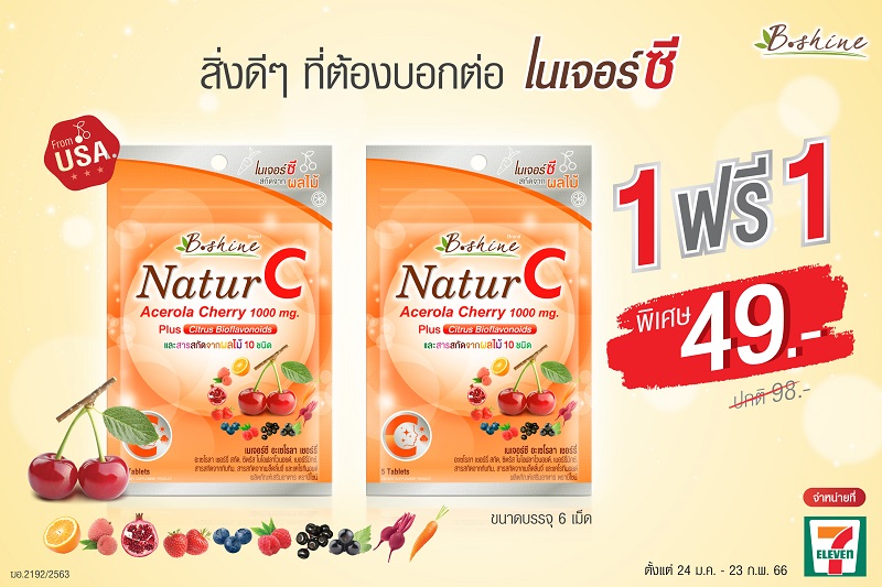 บริษัท บีไชน์ นูทริชั่น พลัส จำกัด ผู้จัดจำหน่าย “บีไชน์ เนเจอร์ซี” วิตามินซีธรรมชาติ 100% ได้จัดโปรโมชั่นราคาพิเศษ “บีไชน์ เนเจอร์ซี” แบบซองพกพาสะดวก ขนาด 6 เม็ด ซื้อ 1 แถม 1 เพียง 49 บาท จากปกติ ราคา 98 บาท ซื้อได้ตั้งแต่วันนี้ – 23 กุมภาพันธ์ 2566 ที่ร้านเซเว่น อีเลฟเว่น ทั่วประเทศ