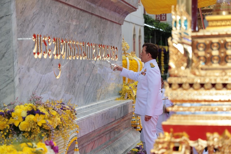 ต่อจากนั้น พระบาทสมเด็จพระเจ้าอยู่หัว ทรงสรงพระบรมสารีริกธาตุ ทรงบรรจุพระบรมสารีริกธาตุลงในพระกรัณฑ์ แล้วทรงบรรจุพระกรัณฑ์ลงในพระเจดีย์ พระราชทานแก่เจ้าพนักงานพระราชพิธีอัญเชิญไปประดิษฐานในบุษบกหน้าองค์ “พระพุทธธรรมกายเทพมงคล”