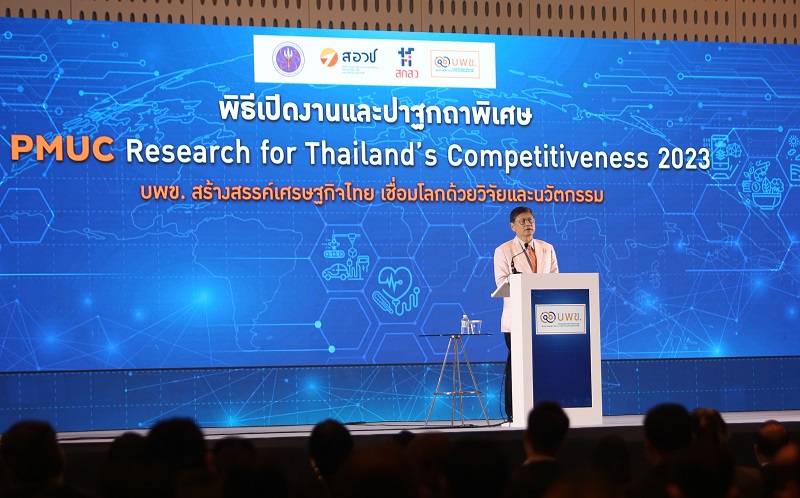 หน่วยบริหารและจัดการทุนด้านการเพิ่มความสามารถในการแข่งขันของประเทศ (บพข.) ภายใต้สำนักงานสภานโยบายการอุดมศึกษา วิทยาศาสตร์ วิจัยและนวัตกรรมแห่งชาติ (สอวช.) กระทรวงการอุดมศึกษา วิทยาศาสตร์ วิจัยและนวัตกรรม (อว.) จัดงาน “ บพข. สร้างสรรค์เศรษฐกิจไทย เชื่อมโลกด้วยงานวิจัยและนวัตกรรม ประจำปี 2566 หรือ PMUC Research for Thailand’s Competitiveness 2023” ขึ้นอย่างยิ่งใหญ่เป็นครั้งแรก โดยมี ศาสตราจารย์พิเศษ ดร.เอนก เหล่าธรรมทัศน์ รัฐมนตรีว่าการกระทรวงการอุดมศึกษา วิทยาศาสตร์ วิจัยและนวัตกรรม เป็นประธานเปิดงานพร้อมกล่าวปาฐกถาพิเศษ และเป็นประธานในพิธีลงนามบันทึกข้อตกลงความร่วมมือพัฒนาเทคโนโลยีขั้นสูง (Deep Tech) เพื่อขยายผลให้เกิดมูลค่าทางเศรษฐกิจดิจิทัล ระหว่าง บพข. และสำนักงานส่งเสริมเศรษฐกิจดิจิทัล (สศด. หรือ depa) และการลงนามบันทึกข้อตกลงความร่วมมือ ฉบับที่ 2 ในด้านการพัฒนาพลังงานสะอาด (Carbon Footprint)