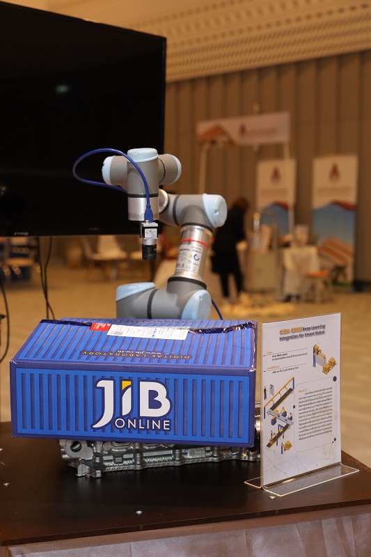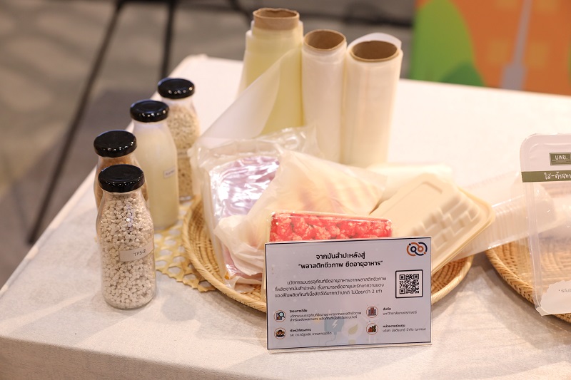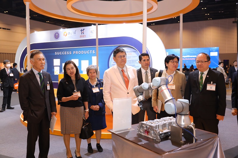 ส่วนภาคนิทรรศการ มีการนำเสนอศักยภาพของผลงานวิจัยไทยที่ บพข. ให้การสนับสนุนการทำงานร่วมกันระหว่างนักวิจัยกับผู้ประกอบการ ใน 8 กลุ่มอุตสาหกรรม และที่น่าสนใจ คือ ตัวอย่างผลงานวิจัยที่ได้รับการผลักดันจนสามารถออกสู่ตลาดได้สำเร็จ เช่น “ เส้นโปรตีนไข่ขาว ” นวัตกรรมด้านอาหารที่ช่วยให้คนไทยมีสุขภาพที่ดี ผลงานวิจัยจากคณะสหเวชศาสตร์ และบริษัท ทานดี อินโนฟูดจำกัด ภายใต้ศูนย์บ่มเพาะธุรกิจ จุฬาลงกรณ์มหาวิทยาลัย ที่เอาใจคนชอบกินเส้น โดยทำจากโปรตีนไข่ขาว 100% โปรตีนสูง ไขมันต่ำ และปราศจากกลูเตน ผลงานนี้ได้รับรางวัลมาแล้วมากมาย และเป็น 1 ใน 21 ทีมสุดท้ายที่ผ่านการประกวดสตาร์ทอัพด้านอาหารแห่งอนาคต ซึ่งได้มีโอกาสเสิร์ฟให้กับผู้นำเขตเศรษฐกิจในการประชุมเอเปคที่ผ่านมา ปัจจุบันมีการผลิตเพื่อจำหน่ายภายใต้แบรนด์ “ทานน์ดี” นอกจากนี้ยังมี “ฟิล์มปิดหน้าถาดบรรจุภัณฑ์จากเม็ดพลาสติกที่ย่อยสลายได้ทางชีวภาพ” ผลงานวิจัยจากศูนย์เทคโนโลยีโลหะและวัสดุแห่งชาติ (เอ็มเทค) สำนักงานพัฒนาวิทยาศาสตร์และเทคโนโลยีแห่งชาติ (สวทช.) ซึ่งต่อยอดความร่วมมือกับมูลนิธิโครงการหลวงและ บริษัท ทานตะวันอุตสาหกรรม จำกัด (มหาชน) ในการประยุกต์ใช้กับถาดสลัดของโครงการหลวง ที่นอกจากจะเป็นมิตรกับสิ่งแวดล้อมแล้ว ยังมีความบาง ใส ไม่เกิดฝ้า และช่วยยืดอายุผักสลัดให้คงสภาพสดใหม่ในชั้นวางจำหน่าย และ “นํ้ายาล้างผักจากเอนไซม์สลายสารพิษฆ่าแมลงที่ตกค้างในผักและผลไม้” ผลงานวิจัยจาก บริษัท ไบโอม จำกัด ดีพเทคสตาร์ทอัพด้านเทคโนโลยีชีวภาพ ซึ่ง spin-off จากคณะวิทยาศาสตร์ จุฬาลงกรณ์มหาวิทยาลัย และร่วมทุนกับ บริษัท บีบีจีไอ จำกัด (มหาชน) โดยน้ำยาล้างผักฯ นี้มีจุดเด่นที่เป็นการสลายโครงสร้างความเป็นพิษของยาฆ่าแมลง ไม่ใช่การชะล้างเหมือนน้ำยาล้างผักทั่ว ๆ ไป ทำให้เป็นการตัดวงจรความเป็นพิษ ไม่มีสารพิษตกค้างในน้ำ จึงปลอดภัยกับผู้บริโภคและสิ่งแวดล้อม