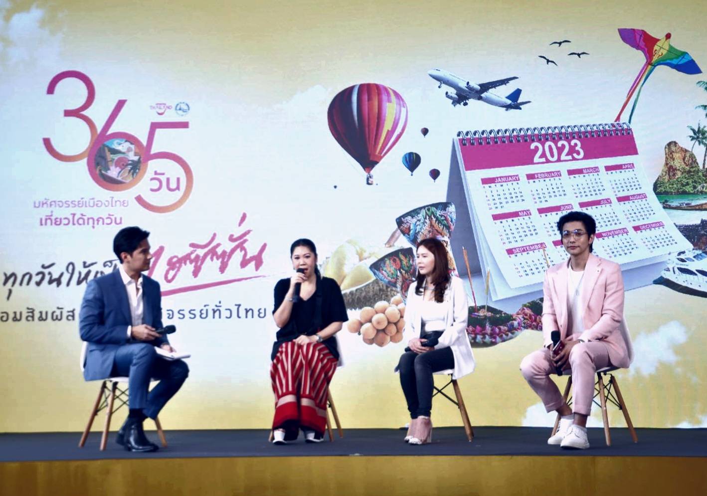 ทั้งนี้ ภายในงานแถลงข่าวฯ ได้มีการจัดพูดคุยภายใต้หัวข้อ “โครงการ 365 วัน มหัศจรรย์เมืองไทย เที่ยวได้ทุกวัน” โดยมีนางสาวฐาปนีย์ เกียรติไพบูลย์ รองผู้ว่าการด้านตลาดในประเทศ ททท. ตัวแทนจากบริษัท คลูก เทคโนโลยี (ไทยแลนด์) จำกัด และ ลี-ฐานัฐพ์ โล่ห์คุณสมบัติ นักแสดง เข้าร่วมพูดคุย เพื่อแลกเปลี่ยนเกี่ยวกับทิศทางการการท่องเที่ยวไทยในปี 2566 โดย ททท. คาดหวังว่า การดำเนินโครงการ “365 วัน มหัศจรรย์เมืองไทย เที่ยวได้ทุกวัน” จะช่วยกระตุ้นให้นักท่องเที่ยวออกเดินทางเพื่อสัมผัสประสบการณ์ท่องเที่ยวมิติใหม่ที่แตกต่างไปจากเดิมในช่วงนอกฤดูท่องเที่ยวมากขึ้น รวมถึงร่วมขับเคลื่อน ให้การท่องเที่ยวไทยกลับมาคึกครื้นอีกครั้งในปีท่องเที่ยวไทย 2566 นี้
