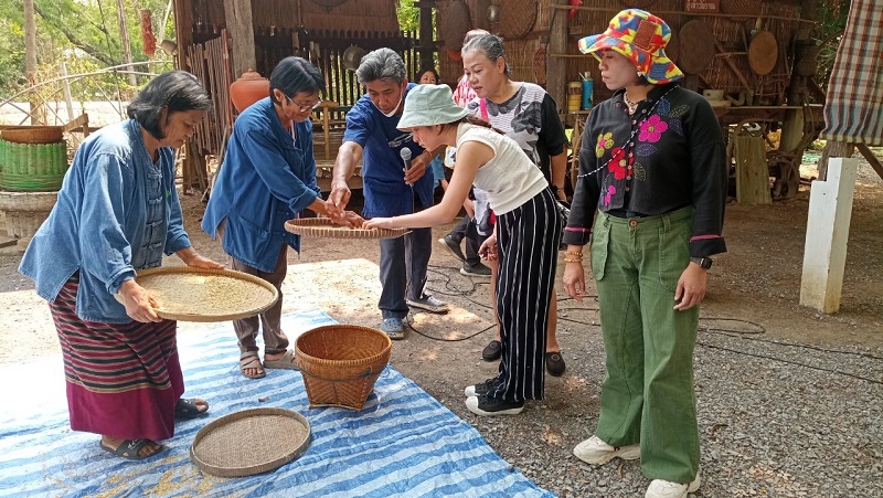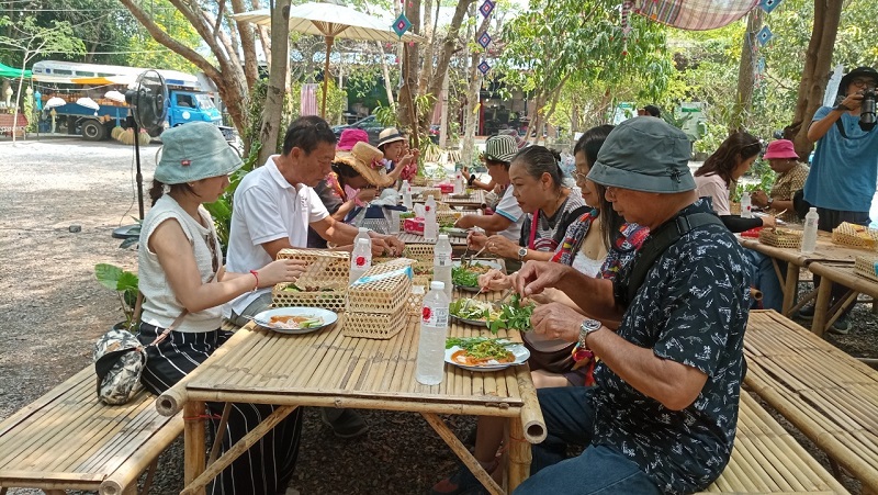นางวนิดา ศรีเม่น กำนันสาวคนเก่งยังคงเป็นผู้นำชุมชนที่แข็งแกร่งขึ้นทุกวัน ทำให้ชาวตำบลม่วงงาม มีวิถีชีวิตที่ยังยืนบนวัฒนธรรมที่จับต้องได้ หลังจากทานอาหารเครื่องดื่มเสร็จ ก็ถึงลานกิจกรรมที่ทุกคนจะมาเรียนรู้การสานตาเหลวด้วยไม้ตอกที่ทำมาจากไม้ไผ่ เป็นความเชื่อที่เป็นสิริมงคล พวกเราทำกิจกรรมกันอย่างสนุกสนานแล้วแต่ว่าใครจะมีฝีมือ สนใจอยากเรียนรู้วิถีชีวิตชุมชนลาวเวียงติดต่อไปที่กำนันไก่ วนิดาโทร 085-549-9197 เราอำลาหอชาวนาโคกนาสัยอีกครั้ง