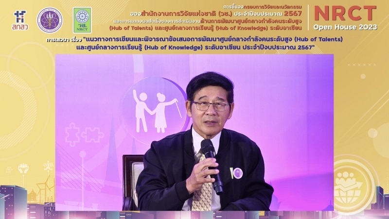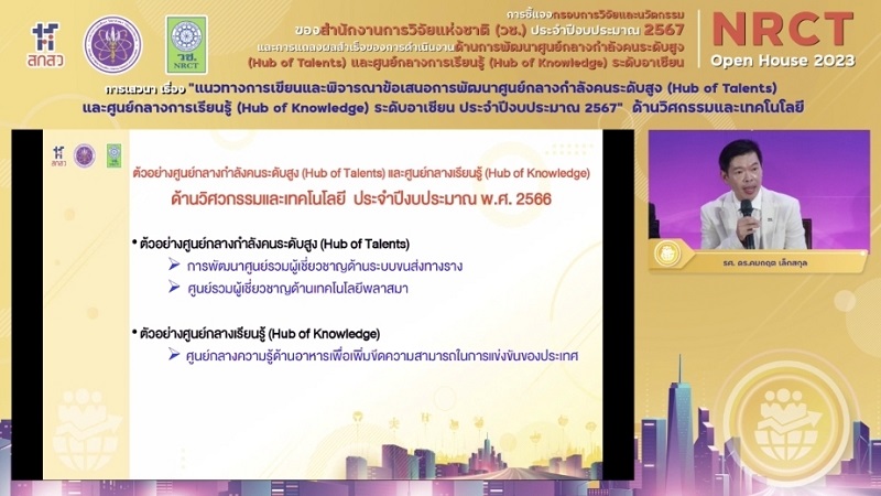 ถัดมา เป็นการเสวนาเรื่อง “แนวทางการเขียนและพิจารณาข้อเสนอการพัฒนาศูนย์กลางกำลังคนระดับสูง (Hub of Talents) และศูนย์กลางการเรียนรู้ (Hub of Knowledge) ระดับอาเซียน ประจำปีงบประมาณ 2567” โดย ดร.วิจารย์ สิมาฉายา เป็นผู้ดำเนินการเสวนา ประกอบด้วยผู้ร่วมเสวนาและประเด็นเสวนา ดังนี้ ในประเด็น “ด้านวิทยาศาสตร์การแพทย์และสุขภาพ”โดย ศ.กิตติคุณ นพ.สุทธิพร จิตต์มิตรภาพ ในประเด็น “ด้านสังคมศาสตร์และมนุษยศาสตร์” โดย ศ.พิเศษ ดร.กาญจนา เงารังสี ในประเด็น “ด้านวิศวกรรมและเทคโนโลยี” โดย รศ. ดร.คมกฤต เล็กสกุล ในประเด็น“ด้านวิทยาศาสตร์ธรรมชาติ” โดย ดร.วิจารย์ สิมาฉายา และในประเด็น“ด้านอุตสาหกรรมเป้าหมาย” โดย ศ. ดร.สักกมน เทพหัสดิน ณ อยุธยาโดย และในประเด็น “ด้านเกษตรศาสตร์” โดย คุณสุนันทา สมพงษ์