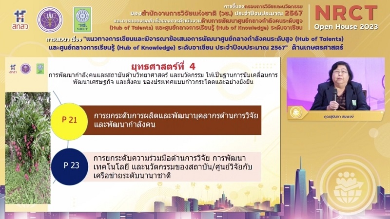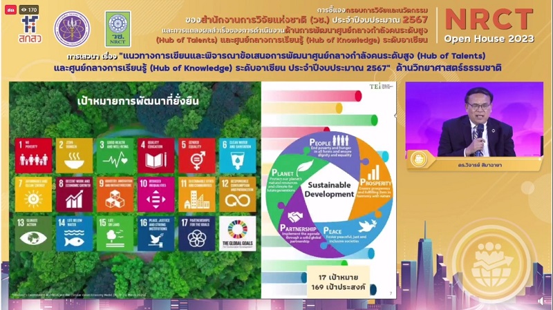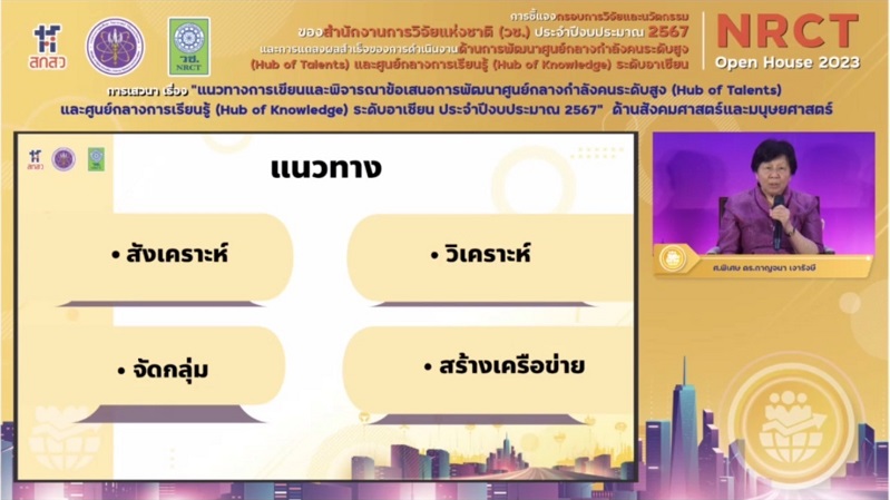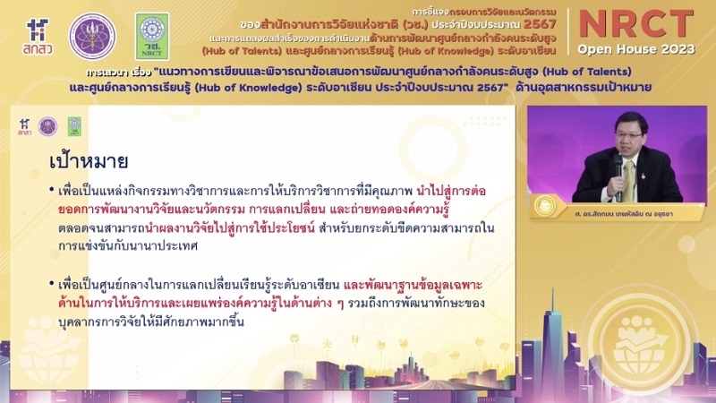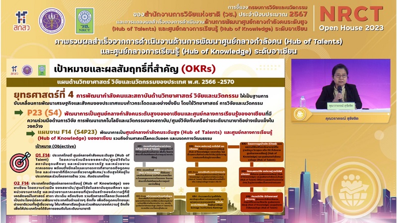 วันที่ 19 มิถุนายน 2566 สำนักงานการวิจัยแห่งชาติ (วช.) กระทรวงการอุดมศึกษา วิทยาศาสตร์ วิจัยและนวัตกรรม จัดการประชุมชี้แจงกรอบการวิจัยและนวัตกรรม ประจำปีงบประมาณ 2567 และแถลงผลสำเร็จจากการวิจัยและนวัตกรรม NRCT Open House 2023 โดยมี ดร.วิภารัตน์ ดีอ่อง ผู้อำนวยการสำนักงานการวิจัยแห่งชาติ เป็นประธานเปิดการประชุมฯ เพื่อประชาสัมพันธ์เกี่ยวกับการรับข้อเสนอการวิจัยและนวัตกรรม และกรอบการวิจัยและนวัตกรรมที่ วช. ให้การสนับสนุนทุนการวิจัยและนวัตกรรม ประจำปีงบประมาณ 2567 ซึ่งกิจกรรมดังกล่าว จัดขึ้นระหว่างวันที่ 19 – 27 มิถุนายน 2566 ในรูปแบบ onsite ณ ห้องจอมพลสฤษดิ์ ธนะรัชต์ ณ อาคาร วช.1 และในรูปแบบออนไลน์ผ่าน (VDO Conference) ด้วยระบบ Zoom การถ่ายทอดสด (Live Streaming) ผ่านช่องทางออนไลน์ Facebook ของสำนักงานการวิจัยแห่งชาติ ซึ่งกิจกรรมในวันนี้จัดขึ้นเป็นวันแรกใน “ด้านการพัฒนาศูนย์กลางกำลังคนระดับสูง (Hub of Talents) และศูนย์กลางการเรียนรู้ (Hub of Knowledge) ระดับอาเซียน”