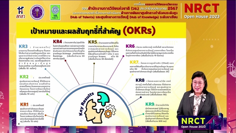 ทั้งนี้ การเข้าร่วมรับฟังการชี้แจงกรอบการวิจัยและนวัตกรรม ประจำปีงบประมาณ 2567 และการแถลงผลสำเร็จจากการวิจัยและนวัตกรรมของ วช. NRCT Open House 2023 มีประเด็นการชี้แจงกรอบการวิจัยที่น่าสนใจ 9 ด้าน ในแต่ละวัน ดังนี้ 1) ด้านการพัฒนาศูนย์กลางกำลังคนระดับสูงและศูนย์กลางการเรียนรู้ระดับอาเซียน 2) ด้านสังคมและความมั่นคง 3) ด้านการพัฒนาเส้นทางอาชีพนักวิจัยและนวัตกรรมและการวิจัยเพื่อฐานทางวิชาการ 4) ด้านการรองรับสังคมสูงวัย 5) ด้านสัตว์เศรษฐกิจ 6) ด้านทรัพยากรธรรมชาติและสิ่งแวดล้อม 7) ด้านการพัฒนาเทคโนโลยีอุตสาหกรรม 8) ด้านเศรษฐกิจและการเกษตร และ 9) ด้านการจัดการความรู้การวิจัยและถ่ายทอดเพื่อการใช้ประโยชน์ (KM) ซึ่งการชี้แจงกรอบการวิจัย ทั้ง 9 ด้าน นั้น จะทำให้นักวิจัยได้รับทราบข้อมูลที่สำคัญไปสู่การพัฒนาและต่อยอดงานวิจัยในอนาคต