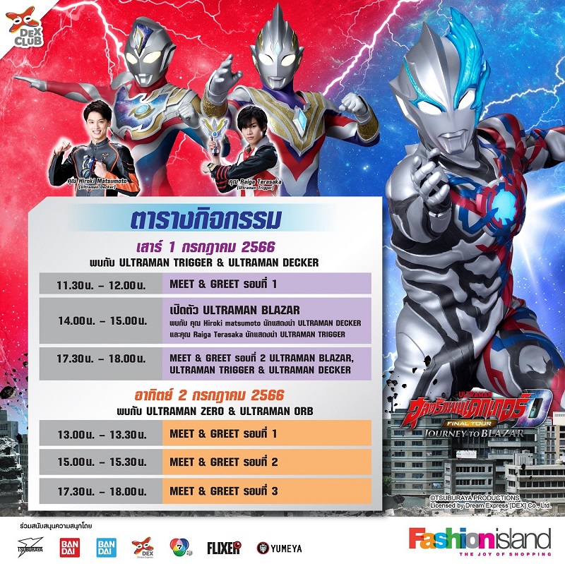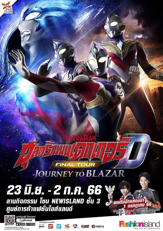 เตรียมตัวให้พร้อม แล้วมาสนุกสุดฟิน กับงานเปิดตัวมนุษย์ยักษ์แห่งแสงคนใหม่ Ultraman Blazar : อุลตร้าแมน เบลซาร์ ครั้งแรกในประเทศไทย ก่อนที่จะฉายให้ได้ชมพร้อมกันผ่านช่อง 7HD เร็ว ๆ นี้ โดยครั้งนี้ เดกซ์ ร่วมกับสุดยอดพันธมิตรชั้นนำ TSUBURAYA / BANDAI / FLIXER / YUMEYA / TERO ENTERTAINMENT / ช่อง 7HD และ ศูนย์กาค้าแฟชั่นไอส์แลนด์ จัดเต็มความสนุกส่งตรงจากประเทศญี่ปุ่นมาเอาใจแฟน ๆ ในงาน “Ultraman Decker Final Tour Journey To Blazar” ด้วยการแสดงสุดพิเศษ “Ultraman Mini Stage Show” จากเหล่ายอดมนุษย์อุลตร้าแมนยุคใหม่ และงานแสดงสินค้าลิขสิทธิ์จากคาแร็กเตอร์อุลตร้าแมน พร้อมการจำหน่ายสินค้าลิขสิทธิ์อื่น ๆ ที่ส่งตรงจากญี่ปุ่นในราคาพิเศษอีกมากมาย ให้แฟนชาวไทยได้เข้าร่วมงานกันฟรี!! ระหว่างวันที่ 23 มิ.ย. 66 – 2 ก.ค. 66 ณ ลานกิจกรรม โซน NEWISLAND ชั้น 3 ศูนย์การค้าแฟชั่นไอส์แลนด์