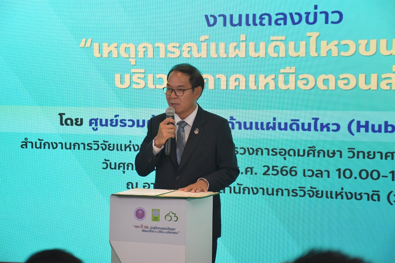 วันที่ 30 มิถุนายน 2566 สำนักงานการวิจัยแห่งชาติ (วช.) กระทรวงการอุดมศึกษา วิทยาศาสตร์  วิจัยและนวัตกรรม โดย ดร.วิภารัตน์ ดีอ่อง ผู้อำนวยการสำนักงานการวิจัยแห่งชาติ ได้มอบหมายให้ นายเอนก บำรุงกิจ รองผู้อำนวยการสำนักงานการวิจัยแห่งชาติ เป็นประธานกล่าวเปิดงานแถลงข่าว “เหตุการณ์แผ่นดินไหวขนาด 4.5 บริเวณภาคเหนือตอนล่าง” พร้อมด้วย ศ. ดร.วันชัย ดีเอกนามกูล คณะทำงานที่ปรึกษาเพื่อการพัฒนาศูนย์รวมผู้เชี่ยวชาญ (Hub of Talents) และศูนย์กลางด้านความรู้ (Hub of Knowledge) ของ วช. ซึ่งภายในงานได้จัดการแถลงข้อมูลเพื่อแลกเปลี่ยนความรู้ในการรับมือกับภัยพิบัติทางธรรมชาติ โดย ผศ. ดร.ปานนท์ ลาชโรจน์ นักวิจัยมหาวิทยาลัยมหิดล เป็นผู้ดำเนินรายการ ประกอบด้วย ประเด็น “ความเสี่ยงภัยแผ่นดินไหวและสถิติการเกิดแผ่นดินไหวในพื้นที่ภาคเหนือตอนล่าง” โดย รศ. ดร.ธีรพันธ์ อรธรรมรัตน์ นักวิจัยมหาวิทยาลัยมหิดล ประเด็น “ลักษณะรอยเลื่อนในพื้นที่ภาคเหนือตอนล่าง” โดย รศ. ดร.ภาสกร ปนานนท์ นักวิจัยมหาวิทยาลัยเกษตรศาสตร์ ประเด็น “ผลกระทบจากแผ่นดินไหวที่มีต่อโครงสร้าง” โดย ศ. ดร.อมร พิมานมาศ นักวิจัยมหาวิทยาลัยเกษตรศาสตร์ และประเด็น “ศูนย์รวมผู้เชี่ยวชาญด้านแผ่นดินไหวและการศึกษาวิจัยที่เกี่ยวข้อง” โดย รศ. ดร.สุทัศน์ ลีลาทวีวัฒน์ นักวิจัยมหาวิทยาลัยเทคโนโลยีพระจอมเกล้าธนบุรี ณ ศูนย์ข้อมูลสารสนเทศกลางด้านวิทยาศาสตร์ วิจัยและนวัตกรรมของประเทศ อาคาร วช.8