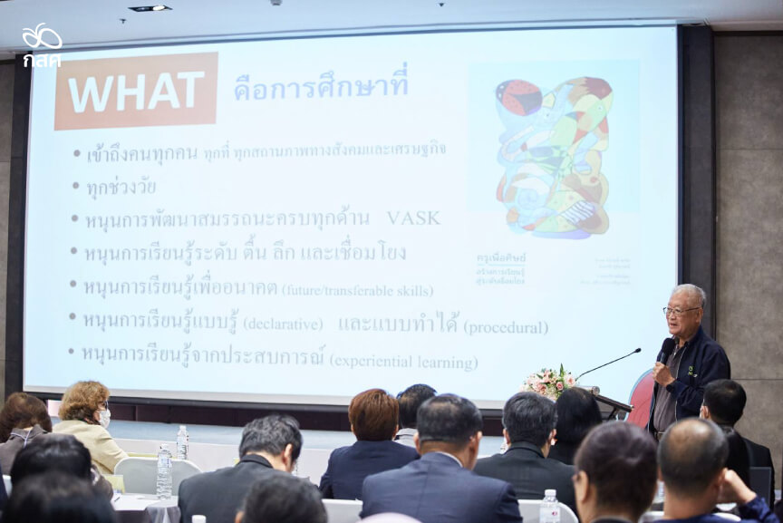 การศึกษาต้องไม่ใช่การศึกษาที่โฟกัสที่สถาบันการศึกษาแต่ต้องโฟกัสตัวผู้เรียน พลเมืองไทย ทุกอายุ ตั้งแต่ ครรภ์มารดาถึงเชิงตะกอน หมายถึง รับผิดชอบคุณภาพพลเมือง ไม่ใช่คุณภาพสถาบันการศึกษาไม่สำคัญ แต่ต้องมองเลยไปถึงตัวผู้เรียนการศึกษาตอบโจทย์ชีวิต สิ่งที่สำคัญคือ ชีวิตคนเราเกิดมาไม่เหมือนกัน แต่เท่าเทียมกันได้ การศึกษาที่มีรูปแบบเดียวตายตัว มีมาตรฐานเดียวตายตัว ไม่สนองโจทย์ของชีวิต เพราะคนเราเกิดมาอยู่ในสถานการณ์ที่ไม่เหมือนกัน ตอบโจทย์ชีวิตที่เลี้ยงตัว และครอบครัว หลุดจากบ่วงปัญหาความยากจนได้ ในขณะเดียวกัน ทำประโยชน์แก่สังคม ชุมชน โลกได้ด้วย ที่สำคัญไม่ตกเป็นเหยื่อ ของอบายมุข และทางเสื่อมทั้งหลายตัวช่วยคือ V Value ค่านิยม กระบวนการจัดการเรียนรู้ หรือจัดการศึกษา การช่วยเด็กพัฒนาตัว V และ A ต้องบูรณาการในทุกชั่วโมงของการเรียน บูรณาการอยู่ในการออกแบบ Learning Ecosystem ระบบนิเวศการเรียนรู้ ไม่เฉพาะโรงเรียน แต่รวมถึง บ้าน ชุมชน และในไอที สื่อสังคมด้วย