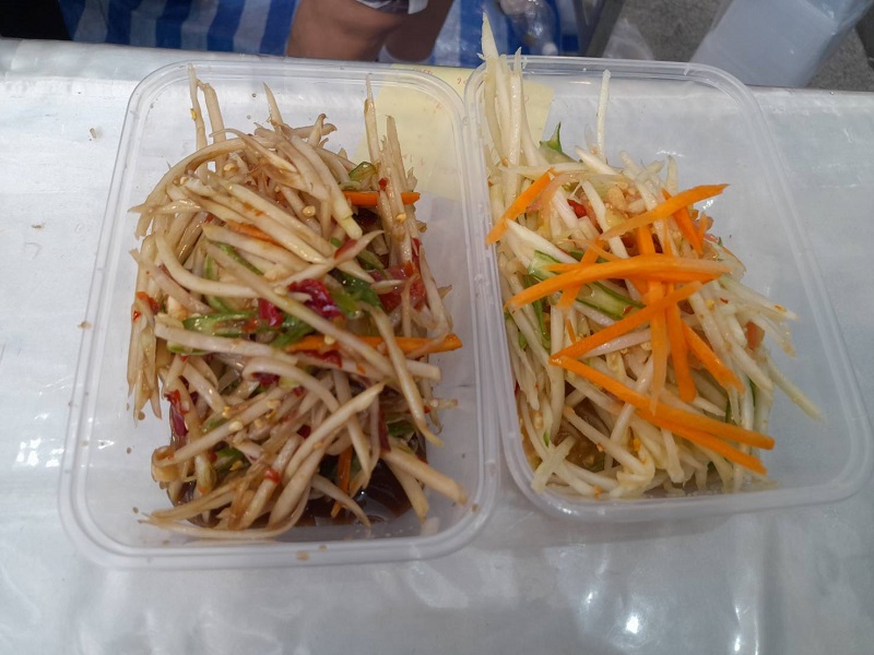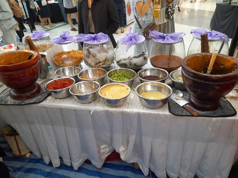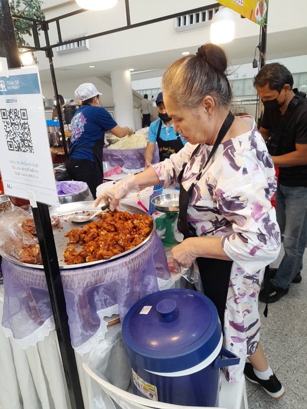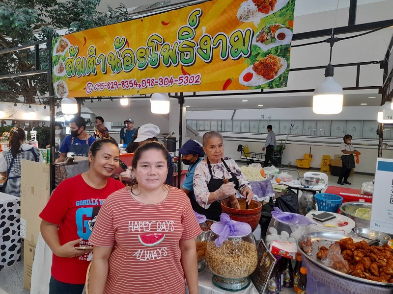 “วันนี้มาเปิดบูธที่ศูนย์ราชการ จากยี่สิบปีที่ไม่ได้ตำส้มตำกลับมาอีกครั้งหนึ่งที่ศูนย์ราชการแม่มา 2-3 ครั้งแล้ว ในหนึ่งเดือนที่นี่จัดสามครั้งก็มาให้เขา สมัยตอนที่แม่ลำบากศูนย์ราชการเขาเรียกมา เขาบอกให้คุณน้อย โพธิ์งามมาตำส้มตำที่นี่ และแม่มีไปเปิดบูธที่โรงพยาบาลพระมงกุฎอีกที่หนึ่ง เพราะตอนนั้นเราก็แย่เหมือนกันแหละ แต่ที่ทางศูนย์ราชการเขารู้จาก รพ.พระมงกุฎเลยเรียกให้เรามา เดือนทั้งเดือนถ้าศูนย์ราชการจัดงานก็จะมาเปิดบูธ เวลาออกบูธก็จะได้ลูกคุณลุงมาช่วยตำแล้วเขาพยายามให้น้อยนั่งตลอด เขายืนตำตั้งแต่สิบโมงเช้าถึงห้าโมงเย็น เขาตำอร่อย และที่จะเปิดตัวก็มีน้ำปลาร้าเพราะลูกค้าถามกันเยอะ ชื่อ “ปลาร้าน้อย โพธิ์งาม” สิ้นปีหรือเปล่าเดี๋ยวดูก่อน เพราะหญิงเขาอยากให้แม่เลิกตำส้มตำ เพราะเขาห่วงแม่แต่เราไม่ได้รวยอะไรหรอก เพราะมีช่วงหนึ่งแม่ต้องเข้าโรงพยาบาลเพราะถังแก๊สทับขา แต่พอขาหายหญิงก็บ่นแม่ก็กลับมาตำส้มตำอีกแล้ว หญิงก็ไม่ได้ว่าอะไรแต่เขาบอกให้แม่ดูแลตัวเองหน่อย แล้วแม่ไปซื้อของทุกอย่างที่ตลาดเองเขาก็กลัวลื่นล้ม แม่ไปคัดสรรทุกอย่างมาทำส้มตำ อย่างมะเขือเทศ(หยิบลูกมะเขือเทศมาให้ดู) ถ้าไปเอามะเขือเทศแดงแจดแจ้ข้างในมันจะเปรี้ยวคนรับประทานจะสอดท้องทำให้ท้องเสีย จริง ๆน้องหญิงเขาก็ให้เงินแม่ตลอดนะ แล้วเขาก็เปิดร้านส้มตำลงทุนให้ล้านกว่าบาท ความคิดแม่เปิดร้านแล้วคอยคนมาซื้อกับที่เขาคอยเราแม่เลยมาเปิดบูธดีกว่า แต่ร้านที่น้องหญิงเปิดก็ยังเปิดอยู่ร้านอยู่ก่อนถึงธนาซิตี้ กม.14 เปิดทุกวัน แต่จะปิดพุธที่ 3 ของเดือน เปิด 10 โมงถึง 2 ทุ่ม