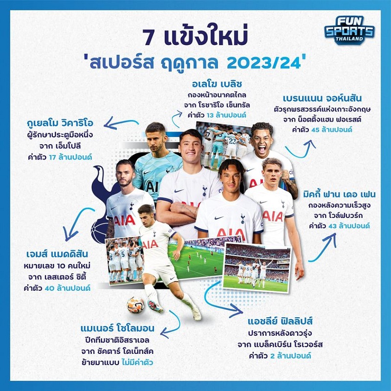 นอกจาก 7 นักเตะใหม่นี้แล้วสเปอร์ส ยังได้กุนซือคนใหม่ชาวออสซี่อย่าง อังเก ปอสเตโคกลู ด้วยสัญญา 4 ปี หรือจนถึงช่วงซัมเมอร์ปี 2027 นี้อีกด้วย แฟนฟุตบอลสามารถติดตามความเคลื่อนไหวของทีมไก่เดือยทอง และทีมอื่น ๆ รวมถึงกีฬาต่าง ๆ ได้ในเพจ FUN Sports Thailand https://www.facebook.com/FunSportsThailand