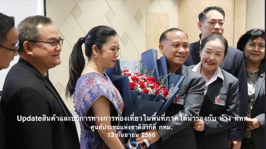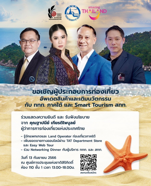 การท่องเที่ยวแห่งประเทศไทย (ททท.) ภูมิภาคภาคใต้ ร่วมกับ สภาอุตสาหกรรมท่องเที่ยวแห่งประเทศไทย (สทท.) จัดประชุม Update สินค้าและบริการท่องเที่ยวภาคใต้ ส่งเสริมการขายกับตัวแทนจำหน่ายเตรียมกระตุ้น “ไทยเที่ยวใต้” ผ่าน ห้าง ททท.Online ชั้น 7 โปรโมชั่นสุดพิเศษนำร่อง Theme “หรอยแรงแหล่งใต้” เมื่อวันที่ 13 กันยายน 2566 ณ ศูนย์การประชุมแห่งชาติสิริกิติ์ กทม. โดยมี ผู้ว่าการการท่องเที่ยวแห่งประเทศไทย (น.ส.ฐาปนีย์ เกียรติไพบูลย์) เป็นประธานการประชุมพร้อมมอบนโยบาย เพื่อกระตุ้นให้นักท่องเที่ยวชาวไทยให้เดินทางไปท่องเที่ยวในพื้นที่ภาคใต้ นำร่อง ผ่านการเสนอขายของ Travel Agent ทั้ง Online และ Offline โดยมีผู้ประกอบการเข้าร่วมการประชุมครั้งนี้ มากกว่า 200 บริษัท