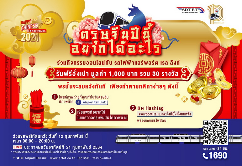 แอร์พอร์ต เรล ลิงก์ จัดกิจกรรมการตลาดออนไลน์อย่างต่อเนื่อง ให้ผู้โดยสารได้ร่วมเฉลิมฉลอง และลุ้นรางวัลสุดพิเศษจากเทศกาลสำคัญในช่วงเดือนกุมภาพันธ์แบบ New Normal ทั้ง “ตรุษจีน” และ “วาเลนไทน์”