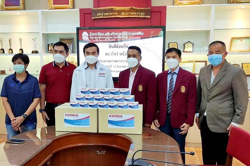 ดร.ภัทร์ฯ ปธ.กก.เวชกรโอสถ มอบยาเคอร่า (Kerra) ให้แก่ ร.ร.สันติราษฏร์วิทยาลัย ใช้ในสถานการณ์แพร่ระบาดโรค covid-19