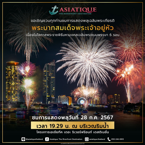 Read Moreขอเชิญชวนร่วมชมการแสดงพลุเฉลิมพระเกียรติ พระบาทสมเด็จพระเจ้าอยู่หัว เนื่องในโอกาสพระราชพิธีมหามงคลเฉลิมพระชนมพรรษา 6 รอบ (72 พรรษา) ที่ เอเชียทีค เดอะริเวอร์ฟร้อนท์